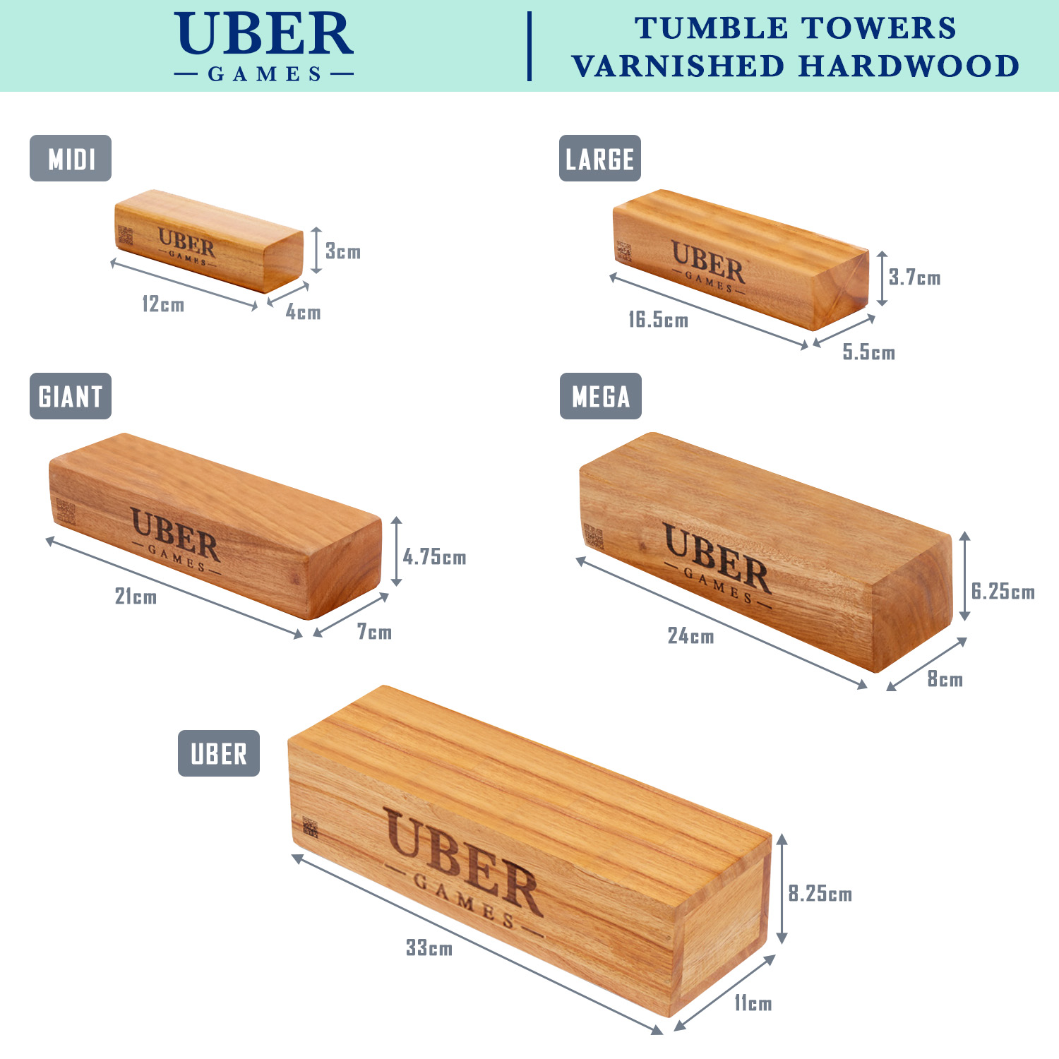 Uber Games Tumble Tower Range is designed to be the centre of attention, bringing people together for memorable moments. Crafted with precision and built to last, these high-quality hardwood blocks feature a varnished finish and offer superior strength and durability over softwood, providing you with a premium Tumble Tower that is made to withstand the test of time. Perfect for all ages and skill levels.